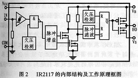 IR2117的內(nèi)部結(jié)構(gòu)及工作原理框圖如圖2所示。它在內(nèi)部集成有一個(gè)施密特觸發(fā)器,一個(gè)脈沖增益電路,兩個(gè)欠壓檢測(cè)及保護(hù)電路,一個(gè)電平移位網(wǎng)絡(luò),一個(gè)與非門,一個(gè)由兩個(gè)MOSFET組成的互補(bǔ)功放輸出級(jí)、一個(gè)RS觸發(fā)器以及一個(gè)脈沖濾波器共九個(gè)單元電路。