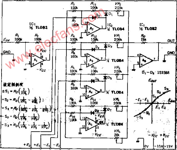 使輸出信號和輸入信號呈現(xiàn)某種函數(shù)關系VO/V1=F(X)的電路稱函數(shù)F(X)發(fā)生器。利用二極管的特性可近似組成函數(shù)發(fā)生器。圖5.4-88所示函