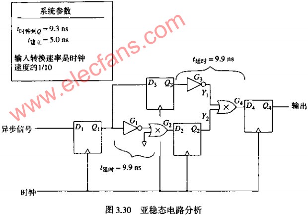 2 亞穩(wěn)態(tài)的概念 亞穩(wěn)態(tài)是指觸發(fā)器無法在某個(gè)規(guī)定時(shí)間段內(nèi)達(dá)到一個(gè)可確認(rèn)的狀態(tài)。當(dāng)一個(gè)觸發(fā)器進(jìn)入亞穩(wěn)態(tài)引時(shí),既無法預(yù)測該單元的輸出電平,也無法預(yù)測何時(shí)輸出才能穩(wěn)定在某個(gè)正確的電平上。在這個(gè)穩(wěn)定期間,觸發(fā)器