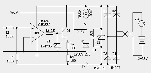 電路中相當(dāng)于一個(gè)特殊的負(fù)載,特殊之處在于變送器的耗電電流在4-20mA之間根據(jù)傳感器輸出而變化。顯示儀表只需要串在電路中即可。這種變送器只需外接2根線,因而被稱為兩線制變送器。工業(yè)電流環(huán)標(biāo)準(zhǔn)下限為4mA