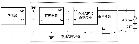 輸出為4~20mA的變送器以兩線制的居多,兩線制即電源、負(fù)載串聯(lián)在一起,有一公共點(diǎn),而現(xiàn)場變送器與控制室儀表之間的信號(hào)聯(lián)絡(luò)及供電僅用兩根電線。
