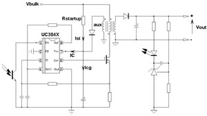 個單獨的元件,而是變壓器的一部分?! D5 離線式開關(guān)電源電路 在這種模式下,開關(guān)頻率與輸入電壓和負(fù)載水平無關(guān),在低輸入電壓和大負(fù)載的情況下,頻率降低,而在高輸入電壓和小負(fù)載的情況下,開關(guān)頻率