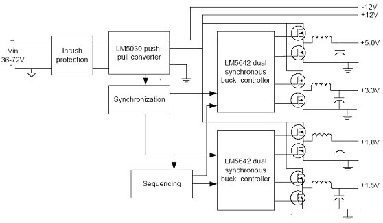 圖 2 中顯示了此類型的 50W 六輸出 DSL 電源的示例。使用 LM5030 推挽變換器隔離并將 – 48V 輸入轉(zhuǎn)換至 +/-12V(每個(gè) 1A),+12V 輸出經(jīng)一對 LM5642 雙同步控制器,產(chǎn)生四個(gè)電壓;+3.3V @ 2.6A、5V @ 1.2A、1.8V @ 1A 和 1.5V @ 7.7A。此結(jié)構(gòu)可確保對所有輸出進(jìn)行有效穩(wěn)壓,并且獲得良好的總體效率。