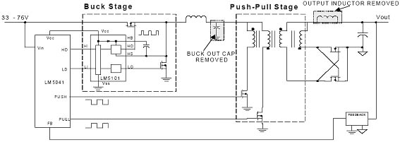 串接的“電壓饋電”降壓和推挽是一種切實(shí)可行的設(shè)計(jì)方法,但是,可以移除幾個(gè)大型元件,同時(shí)仍然保持串級方法的所有性能優(yōu)點(diǎn)。請注意,在圖 3 中,我們使用了兩個(gè)完整的 L-C 濾波器。其中可以去除降壓級電容器和推挽級電感器,并且真正實(shí)現(xiàn)多個(gè)優(yōu)點(diǎn)。這里顯示的是電流饋電串級降壓級和推挽級。推挽級稱為“電流饋電”,因?yàn)橹挥薪祲弘姼衅鞒洚?dāng)電流源,饋送給推挽。在此情況下,推挽開關(guān)需要在轉(zhuǎn)換時(shí)具有非常小的重疊,以維持電感器的電流路徑。在電壓饋電中,需要一段很小的死區(qū)時(shí)間。