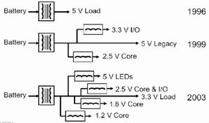 為適應(yīng)IT產(chǎn)品的小型化、便攜式發(fā)展,要求開關(guān)電源的體積更小、效率更高。在能源之星(Energy Star)認(rèn)證和發(fā)達(dá)國家有關(guān)政策的推動下,人們對電源變換器的效率要求日益提高。隨著CPU等超大規(guī)模集成電路的集成度的提高,它所要求的工作電壓日趨下降,而需要的供電電流日趨上升,同時要求電源具有更高的動態(tài)性能。另外電源輸出電壓種類向多元化發(fā)展,圖 1為NORTEL發(fā)布的通信電源輸出電壓多元化發(fā)展的情況。電源產(chǎn)品需要滿足高功率密度、低壓大電流、高動態(tài)性能、輸出電壓種類的多元化、熱切換、可靠性、環(huán)保等更為苛刻的要求。IT產(chǎn)品的價格競爭部分轉(zhuǎn)移到了開關(guān)電源上,要求開關(guān)電源具有更高性能的同時,價格進(jìn)一步下降,電源產(chǎn)業(yè)面臨前所未有的挑戰(zhàn)。