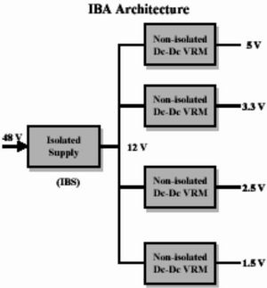 圖 4(b)為中間總線結(jié)構(gòu)。中間總線結(jié)構(gòu)有兩級構(gòu)成,首先通過隔離DC/DC變換器將48V變換成中間的電壓,采用中間的電壓總線,如圖中的12V電壓總線,將電能送至負(fù)荷旁,然后通過第二級非隔離DC/DC模塊(負(fù)荷點電源(POL)+VRM)給負(fù)荷供電。實際上,中間總線結(jié)構(gòu)是分布式結(jié)構(gòu)與集中式結(jié)構(gòu)的折中方案。中間總線結(jié)構(gòu)電源成本較低,具有較好的競爭力。隨著IC供電電壓的下降和所需電流的增加,具有在緊貼負(fù)荷放置DC/DC變換器的要求,推動了IBA的應(yīng)用,非隔離負(fù)荷點電源(POL)得到迅速發(fā)展。