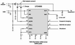 無論設(shè)計者使用獨立的還是基于處理器的電池管理電路,都需要連接到外部電源上,以便對電池進行充電、或者提供輔助供電。供電方式的多樣化又帶來了另一些挑戰(zhàn)。“當便攜式設(shè)備包含一個電池和一個AC適配器或者墻上電源適配器時,最好還是在適配器供電下工作。”Fundaro說,“但若是用戶切斷了AC適配器的連接,電源系統(tǒng)必須切換到電池上,而且不能讓設(shè)備關(guān)機,這正是這些IC所能執(zhí)行的另一項功能。”