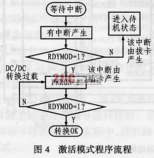 對于激活模式,當MC33560被選中后,RDYMOD引腳將變?yōu)檩敵?,此時可以查詢MC33560的狀態(tài)。如果發(fā)現有卡,則啟動DC/DC轉換器。然后繼續(xù)查詢RDYMOD引腳以檢測是否成功進行了DC/DC轉換。該過程的流程圖如圖4所示。下面是其程序代碼: