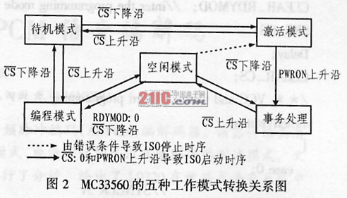 MC33560共有待機模式、編程模式、激活模式、事務處理模式和空閑模式等五種工作模式,其中待機模式為無卡時的工作模式;編程模式為對MC33560進行編程操作時的模式;而在激活模式下,用戶可以查詢卡的狀態(tài)并進行DC/DC轉換;在事務處理模式下?MC33560會保持加到卡上電源和選中的時鐘信號,并根據電源電壓在微處理器 和卡之間進行IO、RESET、C4、C8等引腳的信號電平轉換;空閑模式指的是卡已上電,但沒有進行數據傳輸時的狀態(tài)。圖2所示是五種工作模式之間的轉換關系圖。4 應用設計
