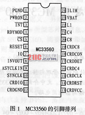 MC33560具有SO-24和TSSOP-24兩種封裝形式,全部管腳可以分為控制器 接口引腳、智能卡接口引腳及電流限制和熱保護引腳等三部分。其引腳排列見圖1。