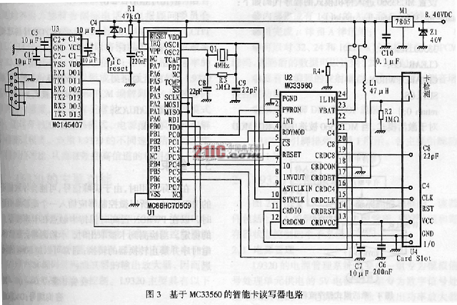 圖3所示是用MC33560智能卡讀寫器接口電路和MC68HC705C9微控制器構成的智能卡讀寫器的硬件應用電路。