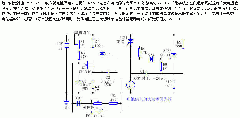 這一閃光器由一個(gè)12V汽車或汽艇電池供電。它提供36~40W輸出和可變的閃光頻率(高達(dá)60次/min),并能實(shí)現(xiàn)獨(dú)立的
