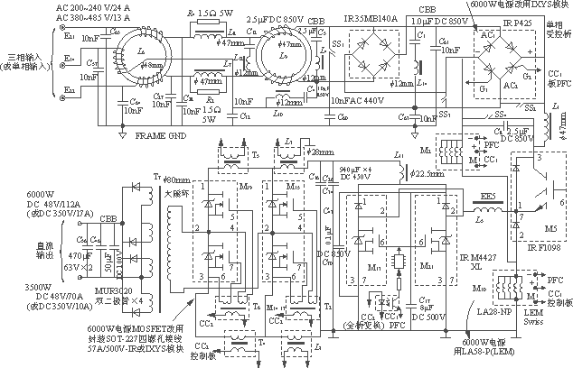 圖1??? 3500W、6000W高檔開關(guān)電源主功率變換器(三環(huán)節(jié))電路圖初擬