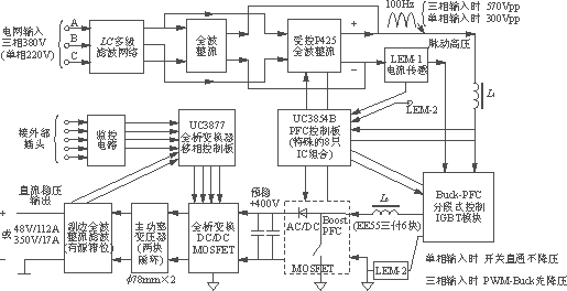 ??? 1)兩種直流輸出電壓和電流大不相同的3500W高檔電源(Vo、Io均相差7倍),其主功率變換電路的三大環(huán)節(jié)基本相同,即電網(wǎng)輸入濾波整流電路;PFC系統(tǒng)的Buck-Boost組合電路亦分段控制;全橋變換器移相式控制ZVS軟開關(guān)電路。