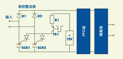 ??? 這種作法也提供勝于熱敏電阻等方法的保護(hù)功能。在經(jīng)過一段時間的低輸入電壓下的低負(fù)載后,負(fù)載的增加可能造成大量電壓損耗,導(dǎo)致裝置跳閘或無法調(diào)整,直至熱敏電阻的溫度上升。有了SCR設(shè)計(jì)提供的浪涌保護(hù)后,輸入電壓不再以這種方式下降。使用SCR方法后,仍會發(fā)生浪涌現(xiàn)象,但浪涌會降低至可接受的水平。這也有助于保險(xiǎn)絲的選擇,因?yàn)槔擞侩娏鞯挠行е敌∮诜€(wěn)態(tài)電流。盡管電流脈沖可能會很大(僅受到電源和輸入濾波器阻抗的限制),浪涌均方根值(是選擇保險(xiǎn)絲或斷路器時的關(guān)鍵參數(shù))還是完全位于可能會使用的最小裝置的性能范圍之內(nèi)。并且,因?yàn)檫@一最新的浪涌控制機(jī)制,保險(xiǎn)絲可以是高熔斷類型中最常見的“F”型(快熔型)。