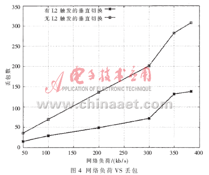 ??? 無(wú)差錯(cuò)的接收分組的最小功率閾值為RSSLD,即觸發(fā)Link_Down原語(yǔ);L2觸發(fā)切換的功率閾值為RSSLGD,即觸發(fā)Link_Going_Down原語(yǔ)。預(yù)測(cè)系數(shù)α為: 3 仿真分析 圖4為不同網(wǎng)絡(luò)負(fù)荷下丟包數(shù)目的對(duì)比,隨著網(wǎng)絡(luò)負(fù)荷增大,丟包的數(shù)目急劇增加。例如網(wǎng)絡(luò)負(fù)荷為50 kb/s時(shí)無(wú)L2觸發(fā)丟包35,有L2觸發(fā)丟包15;網(wǎng)絡(luò)負(fù)荷為384 kb/s時(shí),無(wú)L2觸發(fā)丟包307,有L2觸發(fā)丟包138。由圖4計(jì)算得知,有L2觸發(fā)切換比無(wú)L2觸發(fā)的平均丟包降低59%。