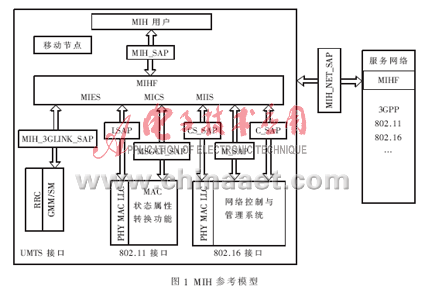 ??? 圖1描述了MIH在協(xié)議棧的位置及移動(dòng)節(jié)點(diǎn)和網(wǎng)絡(luò)之間的交互。所有MIH用戶(hù)具備MIHF實(shí)體,MIHF與MIH用戶(hù)、MIHF與低層之間的通信依賴(lài)于已定義的服務(wù)原語(yǔ),服務(wù)接入點(diǎn)(SAP)包含一套服務(wù)原語(yǔ)[4]。目前802.21標(biāo)準(zhǔn)定義了3種SAP:MIH_SAP、MIH_LINK_SAP和MIH_NET_SAP。MIH_SAP是MIHF實(shí)體與協(xié)議棧高層移動(dòng)性管理協(xié)議之間的接口,通常保持相同的名字和原語(yǔ)。MIH_LINK_SAP是MIHF實(shí)體與協(xié)議棧低層特定接入技術(shù)之間的抽象接口,在特定媒體將重新命名和定義,例如3GPP網(wǎng)絡(luò)命名為MIH_3GLINK_SAP;IEEE 802.11成功鑒權(quán)之前使用MSGCF_SAP傳輸MIH信令,鑒權(quán)之后通過(guò)LSAP傳播有效負(fù)荷;IEEE 802.16在網(wǎng)絡(luò)重接入前使用M_SAP和C_SAP提供鏈路服務(wù),網(wǎng)絡(luò)重接入后使用CS_SAP在數(shù)據(jù)平臺(tái)上提供服務(wù)。MIH_NET_SAP是遠(yuǎn)程MIHF實(shí)體之間信息交互的接口。