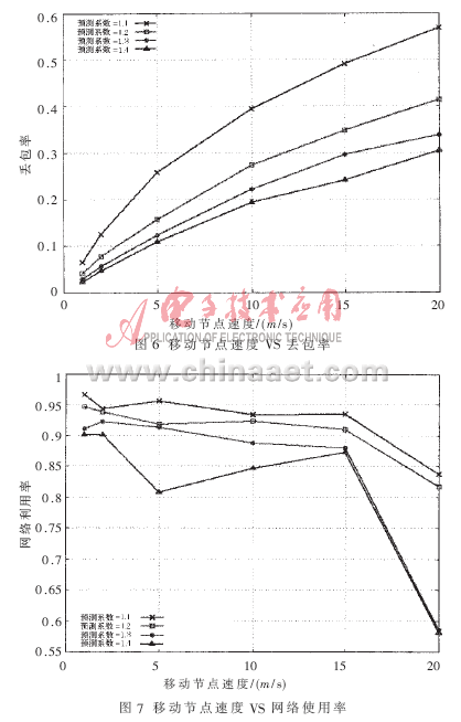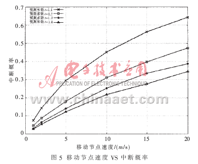 ??? 從圖3和圖4可知,基于MIH協(xié)議的L2觸發(fā)顯著地優(yōu)化了切換期間的時(shí)延和丟包。基于L2觸發(fā)切換方案的預(yù)測(cè)系數(shù)和移動(dòng)節(jié)點(diǎn)速度對(duì)切換性能起決定性作用。因此,本文下面分析不同移動(dòng)速度、不同預(yù)測(cè)系數(shù)對(duì)L2觸發(fā)切換的中斷概率、丟包率和網(wǎng)絡(luò)使用率的影響。