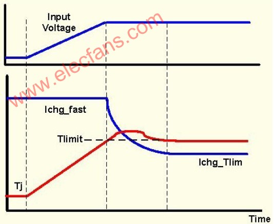 依照一般的規(guī)則,所有的集成充電器IC都必須具有熱關斷,一旦IC的內(nèi)部結點溫度超過最大結點溫度值,熱關斷將被觸發(fā),以確保運轉過程中不會產(chǎn)生熱燒毀。在典型的應用中,當充電電流1A而充電電壓高于電池電壓2-3V時,熱關斷將被激活。激活狀態(tài)下,熱關斷電路將關閉充電器功率級,以避免熱燒毀。通常的熱關斷電路都具有設計上的滯后效應。當芯片溫度降低,功率級方可重新開啟。若芯片溫度再度上升,熱關斷電路將再次被觸發(fā)。其散熱所維持時間可達數(shù)秒,取決于PCB的布板,此類工作模式在以充電狀態(tài)LED指示時一般被稱為“閃光”("flashing")模式。??