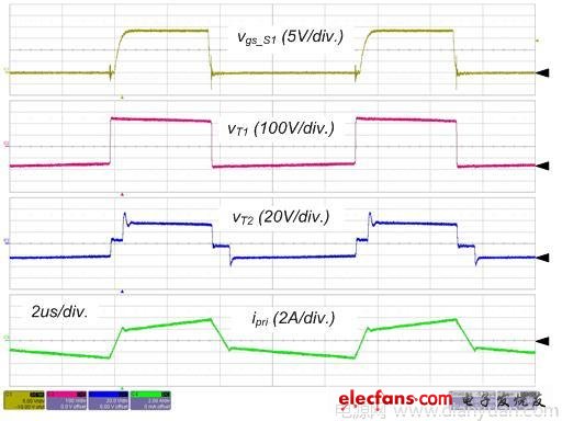 如圖 2 所示,從供電模式 2 開始,由于 S1 開啟,Vin-VCb 施加到變壓器的初級端,勵磁電流 im 以斜率 (Vin-VCb)/Lm.增加,由于 SR2 關(guān)斷,LO1 的電流斜率就由 (Vin-VCb)/n 減去輸出電壓決定。另一方面,LO2 的電流以斜率 –VO/LO2減小,這是流經(jīng) SR1 的續(xù)流 (free-wheeling)。當(dāng)兩個輸出電感分享負(fù)載電流時,SR1 承擔(dān)全部負(fù)載電流。變壓器的次級繞組僅處理 iLO1 ,因而 iLO1/n 是反射到變壓器初級端的電流,它在勵磁電流上疊加,構(gòu)成初級電流 ipri。在實(shí)際上,由于漏電感的現(xiàn)象,所以 vT2 較圖 2 所示的數(shù)值稍低,但我們在這一章段中將忽略這一情況,從而簡化分析。