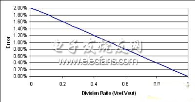 的是,實際并非如此;精度還是輸出電壓與參考電壓之比的強函數(shù)。圖 1 輸出精度是分壓器比、基準(zhǔn)精度和誤差放大器補償?shù)暮瘮?shù)