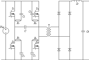 ??? 主電路如圖1所示,功率開關(guān)管S1~S4組成逆變橋,S1、S4和S2、S3由驅(qū)動(dòng)電路以PWM方式控制而交替通斷,將直流輸入電壓VDC變換成高頻方波交流電壓。變壓器副邊電壓經(jīng)全橋整流、Lf及Cf濾波后,輸出穩(wěn)定的直流電壓。