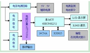DTSF1352 三相電子復(fù)費(fèi)率電能表采用計(jì)量芯片ATT7030A和飛思卡爾公司的8位單片機(jī)M68HC908LJ12實(shí)現(xiàn)。其原理為:線(xiàn)路上實(shí)時(shí)電壓、電流經(jīng)高精度互感器耦合,采樣電路分別采樣后,送到電量計(jì)量專(zhuān)用芯片ATT7030A(A/D轉(zhuǎn)換器轉(zhuǎn)化成數(shù)字信號(hào),通過(guò)片內(nèi)專(zhuān)用DSP運(yùn)算后輸出電能脈沖),通過(guò)脈沖送到MCU中,并根據(jù)預(yù)先設(shè)定的時(shí)段完成分時(shí)有功、無(wú)功電量計(jì)量和最大需量計(jì)算,分別作出相應(yīng)處理,并存貯到EEPROM中;同時(shí)實(shí)現(xiàn)顯示和輸出、RS485串行數(shù)據(jù)傳輸。具體設(shè)計(jì)框圖如圖3。???