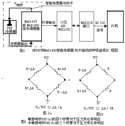 1 傳感器-硅壓阻式傳感器(SPRT)與MAX1450或MAX1457信號(hào)調(diào)理器組成新型智能傳感器及在技術(shù)方案中的功能作一個(gè)分析與介紹。 2、呼吸醫(yī)療監(jiān)視儀與智能傳感器及技術(shù)(其組成框圖,見圖1所示) 2.1呼吸醫(yī)療監(jiān)視儀(見圖1下面所示) 該監(jiān)視儀