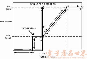 自動(dòng)風(fēng)扇速度控制回路能夠保證在任何給定的溫度條件下風(fēng)扇都能在最佳速度下運(yùn)行,使得系統(tǒng)的電流消耗最小和產(chǎn)生的音頻噪聲最低。這個(gè)回路將風(fēng)扇在預(yù)先設(shè)定的溫度下接通,當(dāng)溫度發(fā)生變化時(shí)再調(diào)整速度。對(duì)最低溫度、溫度范圍、滯后量和電扇啟動(dòng)時(shí)間編程來(lái)確定線路中的運(yùn)行參數(shù),如圖3所示。風(fēng)扇由于慣性不能以最低轉(zhuǎn)速啟動(dòng)。為了克服接通時(shí)的慣性,將增加脈沖寬度直到風(fēng)扇穩(wěn)定運(yùn)行,然后降低脈寬至風(fēng)扇達(dá)到被測(cè)溫度所確定的速度。如果風(fēng)扇被卡住或斷開(kāi)而出現(xiàn)故障,回路會(huì)產(chǎn)生一個(gè)中斷信號(hào)。
