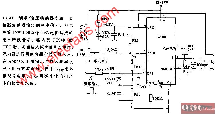 采用TC9400構(gòu)成的電壓、頻率-頻率、電壓轉(zhuǎn)換電路圖