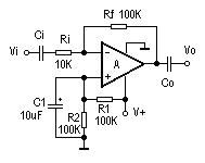 放大器電壓放大倍數(shù)Av僅由外接電阻Ri、Rf決定:Av=-Rf/Ri。負(fù)號(hào)表示輸出信號(hào)與輸入信號(hào)相位相反。按圖中所給數(shù)值, Av=-10。此電路輸入電阻為Ri。一般情況下先取Ri與信號(hào)源內(nèi)阻相等,然后根據(jù)要求的放大倍數(shù)在選定Rf。Co和Ci為耦合電容。