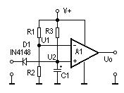 如果將二極管D1去掉,則此電路具有加電延時(shí)功能。剛加電時(shí),U1>U2,運(yùn)放A1輸出低電平,隨著電容C1不斷充電,U2不斷升高,當(dāng)U2>U1時(shí),A1輸出才變?yōu)楦唠娖健?/P>