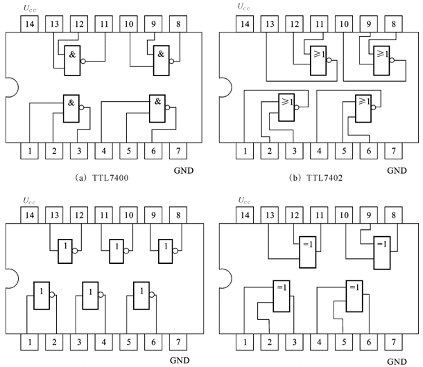 32 TTL器件的典型產(chǎn)品為54系列(軍用品)和74系列(民用品)兩大類。下面給出部分常用器件管腳排列和功能說明。