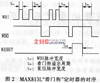 圖2示出MAX813L“看門狗”定時(shí)器的時(shí)序。WDI為“看門狗”的輸入端.用來啟動(dòng)Watchdog使定時(shí)器開始計(jì)數(shù)。當(dāng)RESET有效或WDI輸入為高阻態(tài)時(shí),Watchdog定時(shí)器被清零且不計(jì)數(shù)。當(dāng)復(fù)位信號(hào)變?yōu)榈碗娖角襑DI電平發(fā)生變化(上升沿變化或下降沿變化)時(shí),定時(shí)器開始計(jì)數(shù)。Watchdog一旦被驅(qū)動(dòng)。若在1.6s內(nèi)不再重新觸發(fā)WDI.或WDI不是高阻態(tài)也無復(fù)位信號(hào)時(shí),定時(shí)器將發(fā)生計(jì)數(shù)溢出,使WDO變?yōu)榈碗娖?。通常,Watchdog可使CPU擺脫“死循環(huán)”的困境,因?yàn)橄萑胨姥h(huán)后就不可能發(fā)出WDI脈沖,最多經(jīng)過1.6s后,發(fā)出WDO信號(hào)。