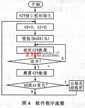 圖3所示的“看門狗”硬件電路足以應(yīng)對中斷服務(wù)程序出現(xiàn)的“死循環(huán)”故障,因此,設(shè)計(jì)軟件時(shí)只需考慮監(jiān)視所有的中斷關(guān)閉故障即可。這樣從而大大簡化軟件流程。系統(tǒng)要求每隔一段時(shí)間接口板要與任務(wù)機(jī)進(jìn)行一次通訊,而通訊過程是在T0中斷處理程序中完成的,同時(shí)接口板還要與相機(jī)主板完成并口通訊,而這一通訊過程是在INT0中斷處理程序中完成的。這樣,一旦由于某種原因T0中斷或INT0被關(guān)閉,那么接口板將無法完成與任務(wù)機(jī)的 429通訊及與相機(jī)主板的并口數(shù)據(jù)通訊。系統(tǒng)軟件 設(shè)計(jì)流程如圖4所示,其中的A0、A1分別為T0、INT0中斷運(yùn)行的狀態(tài)觀測器.每當(dāng)T0、I:NT0中斷1次,A0、A1就相應(yīng)加1。在主程序功能模塊的入口處給A0、A1賦初值,并在中斷處理程序中重新對A0、Al賦新值,由于整個(gè)429數(shù)據(jù)解碼程序一般足夠長.在解碼的過程中接口板至少會(huì)分別完成與429任務(wù)機(jī)及相機(jī)主板的一次通訊,因此在每個(gè)周期429數(shù)據(jù)解算完畢的出口處分別將.A0、A1與其初值進(jìn)行比較,以判斷A0、A1是否發(fā)生變化,從而觀測二個(gè)中斷是否正常執(zhí)行。若中斷因干擾而關(guān)閉,A0、A1的值不發(fā)生變化,程序可轉(zhuǎn)向相應(yīng)函數(shù)進(jìn)行出錯(cuò)處理,進(jìn)而將程序納入正軌。