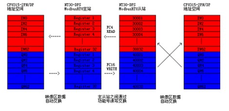 如圖?1所示,兩個遠程站的NT30-DPS均通過其?Profibus-DP接口掛接到?CPU315-2PN/DP的Profibus-DP總線上作為DP從站運行,同時其RS485引出線連接到DX80DR2M?電臺的通訊引出線上,為了實現(xiàn)Modbus?RTU的主從數(shù)據(jù)交換,其中一個?NT30-DPS?設(shè)計為Modbus?RTU?主站運行,而另一臺NT30-DPS?設(shè)計為Modbus?RTU?從站運行。在系統(tǒng)運行時,Modbus?RTU?主站網(wǎng)關(guān)根據(jù)預(yù)先配置的通訊命令表(Modbus?RTU?命令?FC1-FC16)自動讀寫Modbus?RTU?從站網(wǎng)關(guān)的寄存器數(shù)據(jù),然后每個網(wǎng)關(guān)又通過?Profibus-DP輸入輸出映像區(qū)與各自的?CPU315-2PN/DP主站實現(xiàn)數(shù)據(jù)交換,從而實現(xiàn)?CPU315-2PN/DP之間的數(shù)據(jù)交換,數(shù)據(jù)交換的實現(xiàn)如下圖所示: