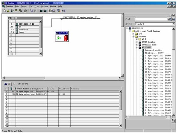 安裝完?GSD?文件后即可進行?Profibus?的從站配置:打開?STEP7?項的?Hardware?窗口,從右邊?Catalog?中選擇NT30-DPS?網(wǎng)關(guān)(在PROFIBUSDP\Additional?Field?Devices\Gateway下),然后拖拉到左面?CPUProfibus?總線上,最后設(shè)置NT30-DPS?的Profibus地址和輸入輸出映像區(qū);STEP7的硬件配置如下圖所示(采用了CPU313C-2DP):