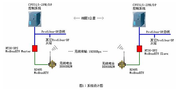 在某工廠的自動控制項目中,需要將相隔?3公里的兩臺西門子?S7-300控制系統(tǒng)設(shè)備實現(xiàn)數(shù)據(jù)交換。由于兩設(shè)備相距甚遠,而且間隔山脈,采用以太網(wǎng)光纖傳輸并不現(xiàn)實,鑒于BANNER公司優(yōu)秀的超遠距離無線傳感產(chǎn)品,設(shè)計采用其surecross系列中的DataRadio無線電臺DX80DR2M。同時,由于兩臺S7-300控制系統(tǒng)均為帶有Profibus-DP主站接口的CPU315-2PN/DP?控制器,而無線電臺?DX80DR2M支持?RS485?Modbus?RTU協(xié)議,因此設(shè)計選用赫優(yōu)訊公司的?NT30-DPS?網(wǎng)關(guān)(Modbus?RTU?轉(zhuǎn)Profibus-DP從站)來實現(xiàn)數(shù)據(jù)交換,系統(tǒng)結(jié)構(gòu)設(shè)計如下: