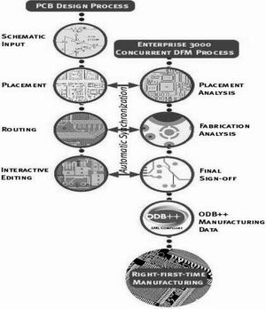DFM技術(shù)在電子設(shè)計(jì)及電子裝配制造上的應(yīng)用主要通過(guò)一定的規(guī)范和流程,輔以專(zhuān)業(yè)化工具來(lái)實(shí)現(xiàn)的,圖1表述的就是運(yùn)用DFM技術(shù)、運(yùn)用專(zhuān)業(yè)化工具協(xié)同PCB設(shè)計(jì)的一個(gè)例子,我們可以看到,在電子產(chǎn)品的設(shè)計(jì)中,布線、器件安排都得到了DFM技術(shù)的支持和反饋,最后得到的是“RIGHT-FIRST-TIME"制造,即第一次投入批量生產(chǎn)的產(chǎn)品就是設(shè)計(jì)正確而且合理的產(chǎn)品,擁有相當(dāng)高的一次成品率。