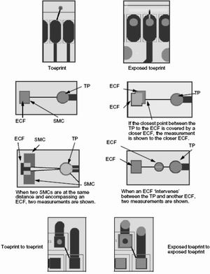 同樣,焊盤(pán)與板邊的臨界分析、測(cè)試點(diǎn)到裸銅的距離分析、焊盤(pán)到焊盤(pán)的距離分析(見(jiàn)圖4-6)都是電子裝配產(chǎn)品制造中重要的考慮因素,遵循DFM規(guī)則必然帶來(lái)可以預(yù)見(jiàn)的產(chǎn)品收益,反之則是預(yù)見(jiàn)的產(chǎn)品損益。