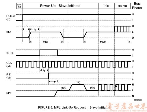 從屬芯片也可通知主控器啟動(dòng)電源。過程如下:從屬芯片先將 MD 線路驅(qū)動(dòng)至邏輯低電平,直至主控器作出回應(yīng),將同樣已驅(qū)動(dòng)至邏輯低電平的 MC 信號(hào)傳回為止。主控器可以檢測(cè) MD 線路是否有電流,并產(chǎn)生 INTR 信號(hào),以便將從屬芯片提出建立連接的請(qǐng)求通知本地主機(jī)。
