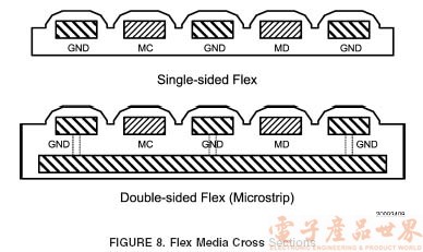 印刷電路板走線、柔性電纜或短的接線都可用作互連的線路。實(shí)際的互連線路的類型及配置要視乎系統(tǒng)的實(shí)際要求而定,例如互連線路的長(zhǎng)短、機(jī)械性能的局限以及電磁兼容性 (EMC) 等要求。柔性電纜是一種成本較低的互連線路,因此經(jīng)常用于小型的電子產(chǎn)品。單面的柔性電纜成本最低,但阻抗一般會(huì)較高,而且所提供的屏蔽保護(hù)極為有限。在正常的應(yīng)用情況下,單面柔性電纜已很足夠,可以支持?jǐn)?shù)據(jù)傳輸速度較慢及噪音較少的應(yīng)用系統(tǒng)。雙面的柔性電纜 (即微帶Microstrip ) 可以提供阻抗更易受控制的通道,即使普通的大小也可輕易組成 50W 負(fù)載的線路。此外,這類電纜可為接地層提供屏蔽,若有需要,也可為線跡提供接地保護(hù),這也是雙面柔性電纜的優(yōu)點(diǎn)。系統(tǒng)至少采用三條信號(hào)傳輸線路,其中兩條供 MD 和 MC 線路使用,而另外一條是共用接地回流電路。MG 接地應(yīng)在鏈路的兩端連接接地,以便將接地環(huán)路覆蓋面積減至最小。圖 8 所顯示的是單面及雙面柔性電纜的橫切面圖。