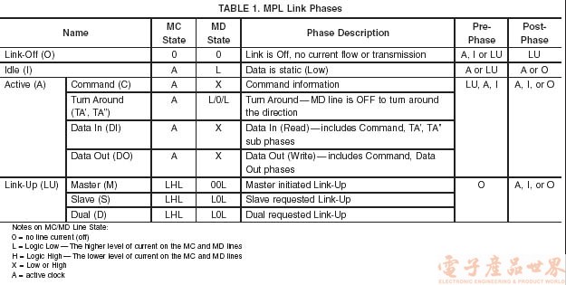 MPL 串行總線分為四個(gè)不同的總線階段,每一階段都由 MC 及 MD 線路的狀態(tài)決定,而其中的兩個(gè)階段有多個(gè)不同狀態(tài)可供選擇。圖表 1 “MPL鏈路的不同階段”顯示 MPL 總線的不同階段。
