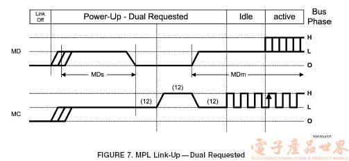 若從屬芯片及主控器同時(shí)啟動(dòng)建立連接請(qǐng)求,便會(huì)出現(xiàn)圖 7 所顯示的時(shí)間序列。由于所需時(shí)間各不相同,因此各時(shí)段可能重疊,以這個(gè)情況來說,系統(tǒng)可以利用這個(gè)序列將 MPL 總線連接起來。當(dāng)總線處于連接中斷階段時(shí),MC 及 MD 線路上的電流會(huì)完全中斷。若主控器及從屬芯片差不多在同一時(shí)間啟動(dòng)通電序列 (此時(shí)的 MC 及 MD 線路已驅(qū)動(dòng)至低電平),從屬芯片會(huì)先行檢測(cè)主控器是否正在驅(qū)動(dòng) MC 線路,然后將其 MD 驅(qū)動(dòng)器失效 (參看 MD)。主控器會(huì)檢測(cè) MC 線路是否處于低電平,然后如圖 5 所示,啟動(dòng)應(yīng)由主控器啟動(dòng)的標(biāo)準(zhǔn)通電序列。正如圖 7 所顯示,通電序列啟動(dòng)后,總線階段會(huì)處于閑置狀態(tài) (也可能處于活躍狀態(tài)),而且可能繼續(xù)維持在閑置狀態(tài)之中,以便將電源關(guān)閉,或重新操作。有一點(diǎn)需要留意,圖 7 并無顯示控制信號(hào)。