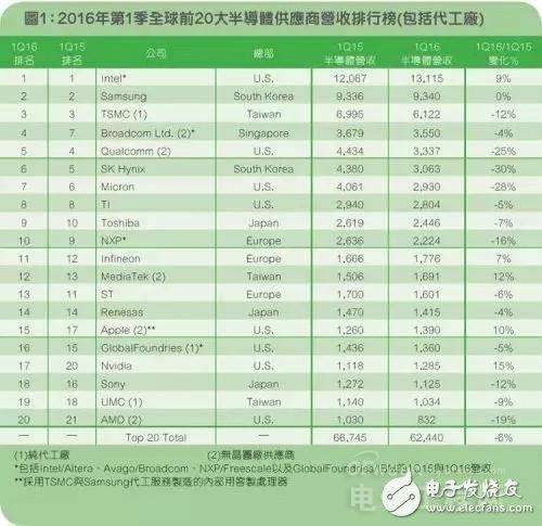 值得注意的是,在表1所列的前20大排行榜(2016年第1季)中,有許多大型晶片供應(yīng)商在過去18個月內(nèi)都經(jīng)歷過大規(guī)模的并購。