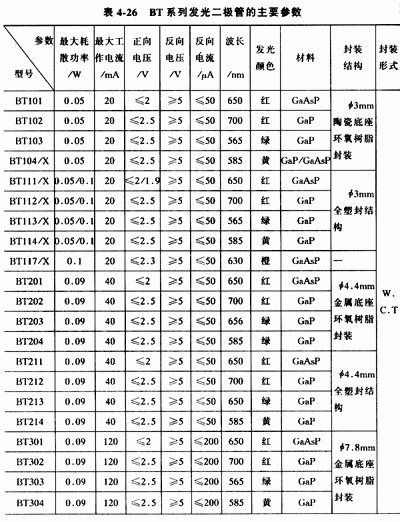 常用的國產(chǎn)普通單色發(fā)光二極管有BT(廠標(biāo)型號(hào))系列、FG(部標(biāo)型號(hào))系列和2EF系列,見表4-26、表4-27和表4-28。?