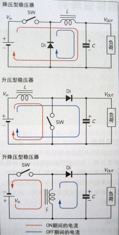 調(diào)整功率晶體管的開關(guān)周期,從輸入電壓源將電能積蓄在電感器中,提供給輸出電容器。通過負(fù)反饋動(dòng)作將輸出電壓控制在一定值。通過開關(guān)和電容器和二極管的組合,基本上可以分為3種開關(guān)穩(wěn)壓器(降壓型、升壓型、升降壓型)。