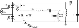 電子鎮(zhèn)流器的主電路由PFC電路和諧振電路兩部分組成??紤]到兩級結(jié)構(gòu)的成本過高,因此將兩級中的功率開關(guān)管共用變成單級結(jié)構(gòu)。圖4所示主電路拓撲就是將Buck-Boost型PFC電路與并聯(lián)負載串聯(lián)諧振電路合成在一起,燈模型采用前面所提到的模型。