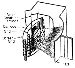 The beam power pentode is a specialized type of pentode. A virtual control grid is formed by an electric field that is set up between the screen and the plate. The schematic representation of the device is very explicit in this regard.