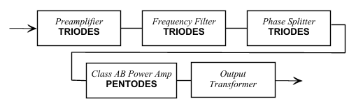 The preamp boosts low level signals and then allows for frequency filtering such as bass, mid, and treble adjustments (this is also known as tone control). The phase splitter takes the preamp signal and splits it into equal and opposite portions. This will be used to drive a class AB power amplifier. It should be noted that some commercial manufacturers use different output stages, such as class A. Although it is important to understand all output stages, class AB is the most common encountered in audio tube amplifiers, especially guitar amplifiers) due to power amplification efficiency. Also, note that the output stage can drastically effect the sonic characteristics of the amplifier. However, this subject is beyond the scope of this paper.